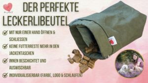 Unser „Hundetrainer“ [Blödes Wort, da er ja uns Menschen verändert und nicht den Hund.] hat einen Futterbeutel gesucht, den es nicht gab. Er soll in Jackentaschen passen, mit einer Hand bedienbar sein und geöffnet in der Tasche bleiben. Denn wie oft rutschen die Beutel in die Jackentasche rein, sind die Öffnungen zu klein, zu groß, nur mit zwei Händen wieder zu schließen? Dazu kommen vollgekrümelte oder verschmierte Hosen- und Jackentaschen. In die man dann auch unter Umständen gar nicht so schnell rein kommt. Kennst du sicher auch, oder? Nachdem er seinen Wunsch bei mir geäußert hatte, rannte er damit bei mir offene Türen ein. Mir ging das auch so richtig auf die Nerven. Also musste ein Beutel her, der genau auf unsere Wünsche abgestimmt ist.